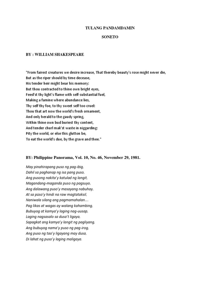 Halimbawa Ng Tulang Soneto. Tagalog Haiku Page 1 Pag-ibig Love-Nakakakilig Kung ikay umiibig Sarap sa dibdib-Sama ng loob Mahirap na magamot Kung walang irog-Mahaling tunay Kasintahan sa buhay Lahat ialay-Masakit nga ba Kung mahal ay nawala Na parang bula-Mahal na kita Sa unang pagkikita Pakakasalan ka-Ang aking puso Sa iyo nakaturo Hanggang sa dulo-Sagutin ako. Ang pag-aalaga at pag-aaruga.