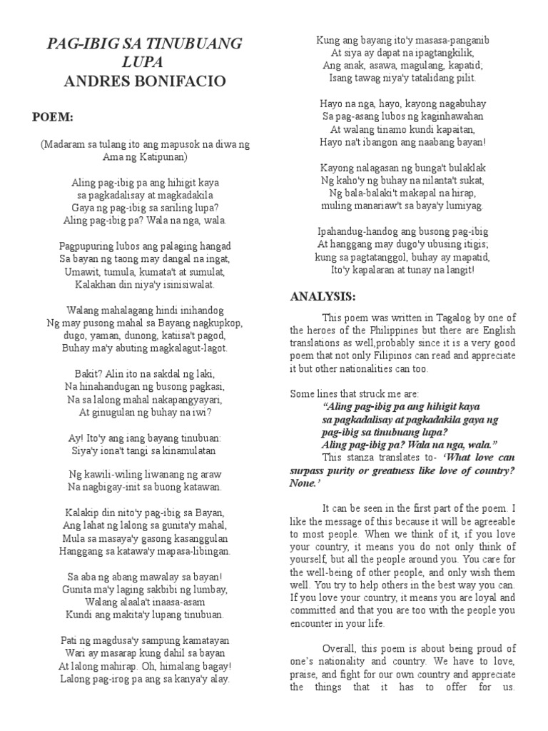 Inalay ni Bonifacio ang tulang ito para sa. Even when the mind repeatedly reads and try to understand. Pag-Ibig sa Tinubuang Lupa ni Andres Bonifacio.